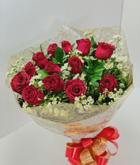 12 -rosas vermelhas em acabamento especial com áster,